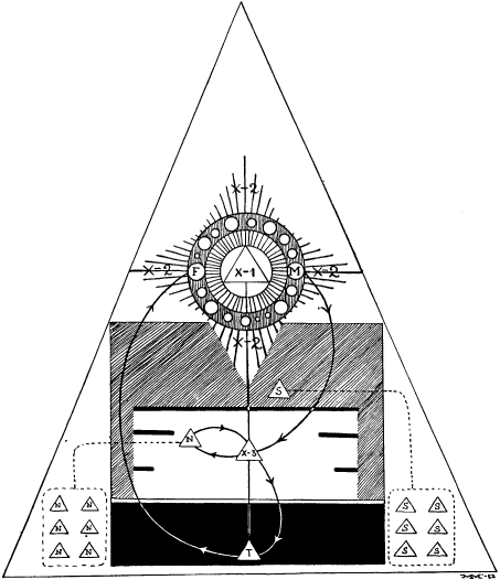 Fra trekanten X-1 går en lige linie gennem X-2 til trekanten X-3 for at understrege disse figurers enhed. På et symbol som dette må de tegnes hver for sig, men det må ikke misforstås, således at man tror, jeg'et er eet sted henne og vor person et andet sted. Men vi må heller ikke tro, at jeg'et er et sted inden i vort fysiske legeme, som vi kan være tilbøjelige til at tro. Jeg'et er hævet over tid, rum og bevægelse, idet det skaber disse foreteelser. Jeg'et er allestedsnærværende, derfor kan der tegnes ikke blot de to trekanter X-1 og X-3 på linie, men også den tredie, trekanten T. Vi ER X-1, den usynlige, vi ER X-3, skuespilleren i livets spil, og vi ER også livets tilskuer, som vi om lidt skal komme tilbage til.