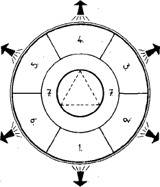 Symbolskitsen illustrerer grundenergiorganisationen og dens tilknytning til Jeget. Sidstnævnte er markeret ved den punkterede top-trekant. Moderenergien, verdensaltets syvende kosmiske grundenergi, der repræsenterer Jegets skabeevne samt bærer, behersker og opretholder de 6 øvrige kosmiske grundenergier, er symboliseret ved det felt, der er markeret ved tallet: 7. De 6 øvrige grundenergier, hvoraf "det skabte" fundamentalt er bygget op, er respektive symboliseret ved figurerne, der er markeret med tallene 1-6.
