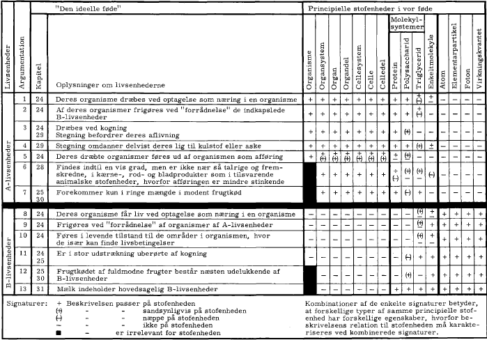 Den metodik, der er anvendt ved identifikationen, fremgår af den skematiske oversigt over Martinus' beskrivelser af A- og B-livsenhedernes egenskaber. Før vi systematisk gennemgår argumenterne for den måde, skemaet er udfyldt på, er det hensigtsmæssigt kort at skitsere principperne for den funktionelle stofenhedsopbygning af jordmenneskenes vigtigste fødemidler.