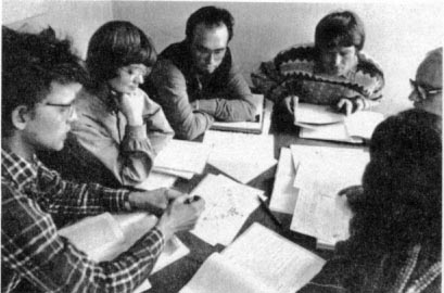 Efter en god nats søvn fastlagde man lørdag morgen selve studiearbejdet. Deltagerne havde fået studiematerialet tilsendt og var i forvejen inddelt i 6 grupper. Hver af grupperne havde et afsnit af bogen som specialopgave, men alle grupper skulle desuden tilegne sig et indtryk af bogens helhed. Det er naturligvis svært at få et overblik over en så indholdsrig bog på så kort tid ved selv at analysere hele bogens struktur. Løsningen på dette problem er selve naturens fremgangsmåde: Samarbejde. Hver gruppe studerede sin sjettedel og forsøgte så godt som muligt at sætte sig ind i denne dels rolle og mening i bogen. Med visse mellemrum samledes så alle 6 grupper for at gøre rede for sine resultater over for hinanden. På denne måde fik alle del i alle gruppers arbejde, og efterhånden tegnede planen for Livets Bog I sig klarere og klarere. Møderne i den store gruppe førte ofte til interessante og animerede diskussioner, som bidrog til at forhøje stemningen og inspirere til ny energi i smågrupperne. Under arbejdets forløb kom der naturligvis en masse tanker op, som undertiden kunne skabe et kaotisk indtryk. Men på samme måde som byggematerialet på en byggeplads får form og struktur efterhånden, så kom alle disse tanker til at falde på plads henimod slutningen af kurset.