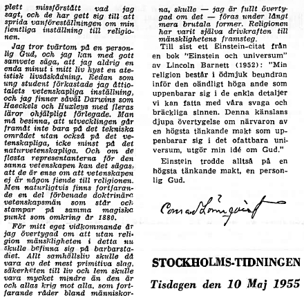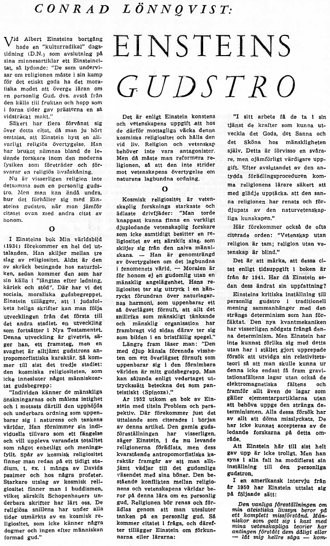 En god svensk ven har sendt mig medfølgende bilag om den store tysk-amerikanske forsker Albert Einsteins gudstro. Jeg tror, det vil være mange af denne afdelings læsere en ligeså stor glæde at gennemlæse det, som det har været for mig. Atter og atter møder vi, der underviser i Martinus verdensbillede spørgsmålet: "Hvad siger videnskaben?" Men videnskaben er ikke bare een ting. Videnskaben repræsenteres af mennesker, som vi andre, og indenfor dens rækker finder vi både meget små og meget store sjæle – og i akkurat samme blandingsforhold som ude i livet. Flertallet af de mennesker, vi kalder videnskabsmænd, er mere intellektuelle håndværkere, end de er forskere i dette ords dybeste betydning. Thi for at være en absolut sand forsker, kræves der foruden stor intelligens også intuition. Og denne egenskab er endnu så ualmindelig, at man ikke med rette kan vente at finde den hos enhver, der har bestået sine rent videnskabelige eksaminer og eventuelt derudover også har erhvervet sig en doktorgrad.