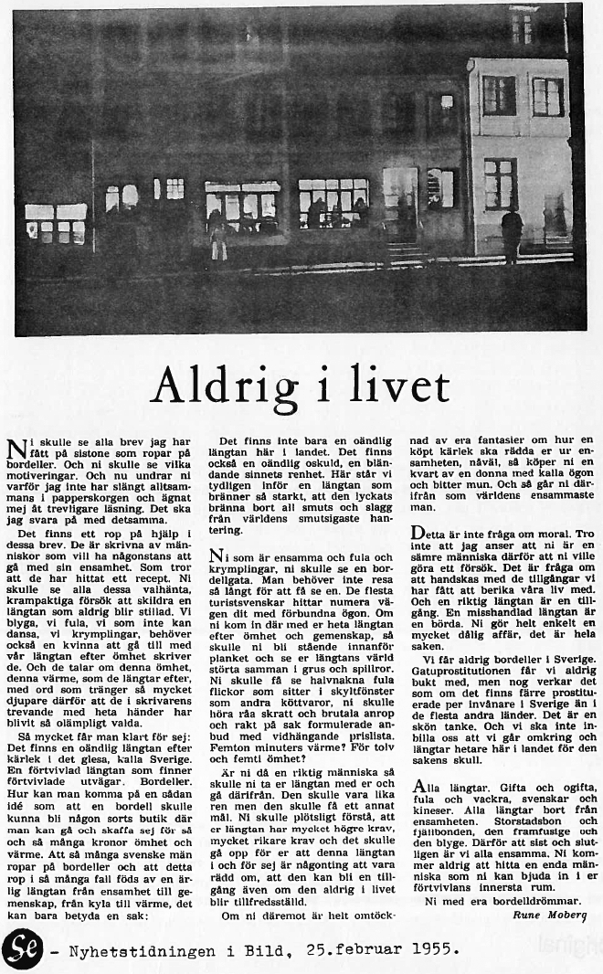 En af vort arbejdes trofaste venner i Sverige, en ung svensk læge, har sendt mig medfølgende bilag og bedt mig kommentere det udfra et kosmisk synspunkt. Selvom jeg godt forstår, at adskillige af vore læsere finder de svenske bilag vanskelige at fatte, så læs dem alligevel grundigt igennem, for svenskerne skriver ofte om problemer, man her i landet går let henover. Bilaget dennegang er et godt eksempel herpå. Intet større bladforetagende her ville åbne sine spalter for en diskussion om bordeller, dertil forekommer emnet for delikat. Men "SE" har altså gjort det, og her har De Rune Mobergs strålende svar. Jeg kender kun denne skribent igennem hans artikler, men hver gang, jeg har læst ham, har jeg måttet spørge mig selv, om Martinus egentlig har nogen bedre "medarbejder" i vort broderland. Gang på gang er hans artikler gennemglødet af den dybe, humane ånd, den vidunderlige tolerance, man altid beder til må være i deres tanker, som taler Martinus sag.