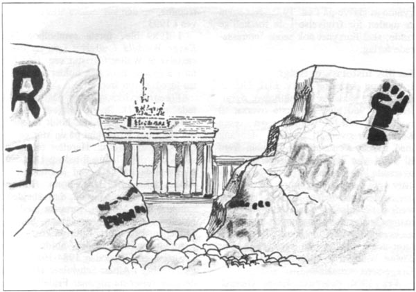 Brandenburger Tor i Berlin set gennem den sprængte mur. Om de nye tilstande vil skabe øget behov for Martinus kosmologi i Tyskland vides endnu ikke. Tegningen stammer fra et postkort.