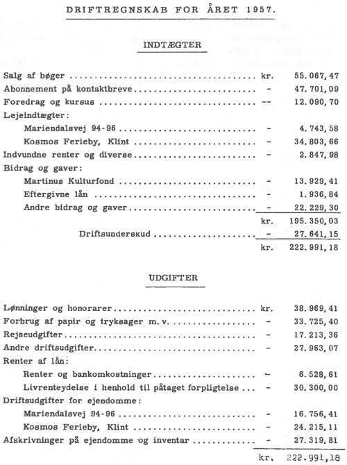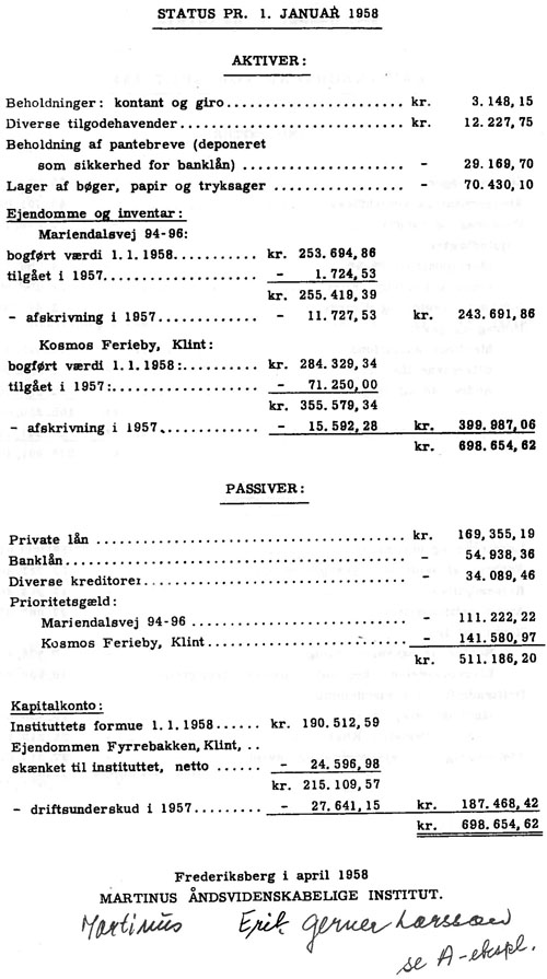 Som konklusion af gennemgangen af instituttets regnskaber for 1957 kan vi udtale, at instituttets økonomiske forhold efter vort bedste skøn er i stærk bedring, men at det stadigt vil være nødvendigt, at alle interesserede hver efter sin evne yder aktiv støtte til at sikre videreførelsen og udbygningen af Martinus' livsværk.