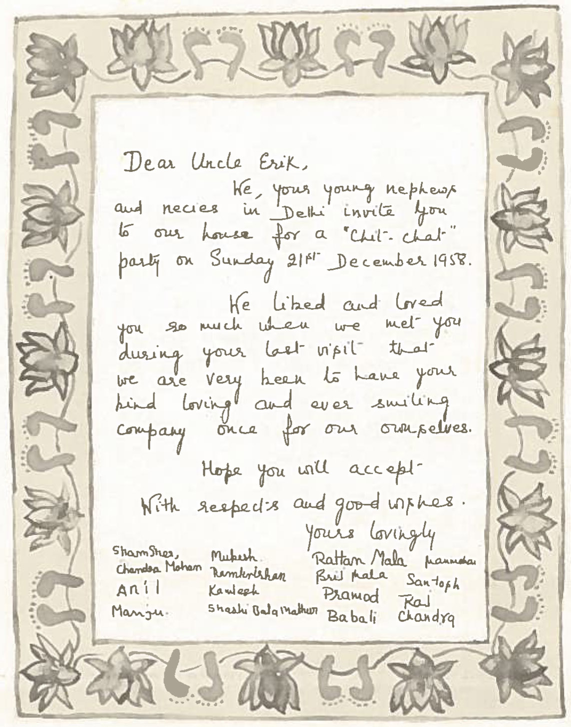 Nuvel, jeg ved ikke, hvordan De ville føle det, dersom De pludselig dumpede ned mellem samtlige ambassadører fra det mellemste og fjerne Østen, samt Afrika. Jeg ved kun, at jeg selv følte mig meget mærkelig tilmode i dette interasiatiske selskab. Vi i vor verdensdel ved i virkeligheden såre lidt om disse menneskers liv. Til gengæld ved de uhyre meget om os. Og møder vi dem på den rigtige måde, griber de vor hånd med begge deres. Det så jeg den aften, hvor f.eks. den kinesiske ambassadør, en ældre, meget venlig udseende mand udtrykte sin varme glæde over, at møde et menneske fra H.C. Andersens land. "Deres land er lille", sagde han. "Men vi kinesere beundrer det meget højt, vi har meget at lære af Danmark!" Pludselig blev der uro i den fjerneste ende af salen, og ligesom automatisk dannede vi to store espalierer. Og der kom Nehru og hans datter Indira Gandhi, smilende og hilsende til alle sider. Begge så meget overraskede på mig og smilte så meget hjerteligt til mig og hilste på indisk vis. Jeg skal møde dem begge inden længe, men da jeg ved, hvor optaget de er, vil jeg vente, til alle nytårsfestlighederne er overstået, og livet herude igen, forhåbentlig også for dem, har antaget lidt roligere former.