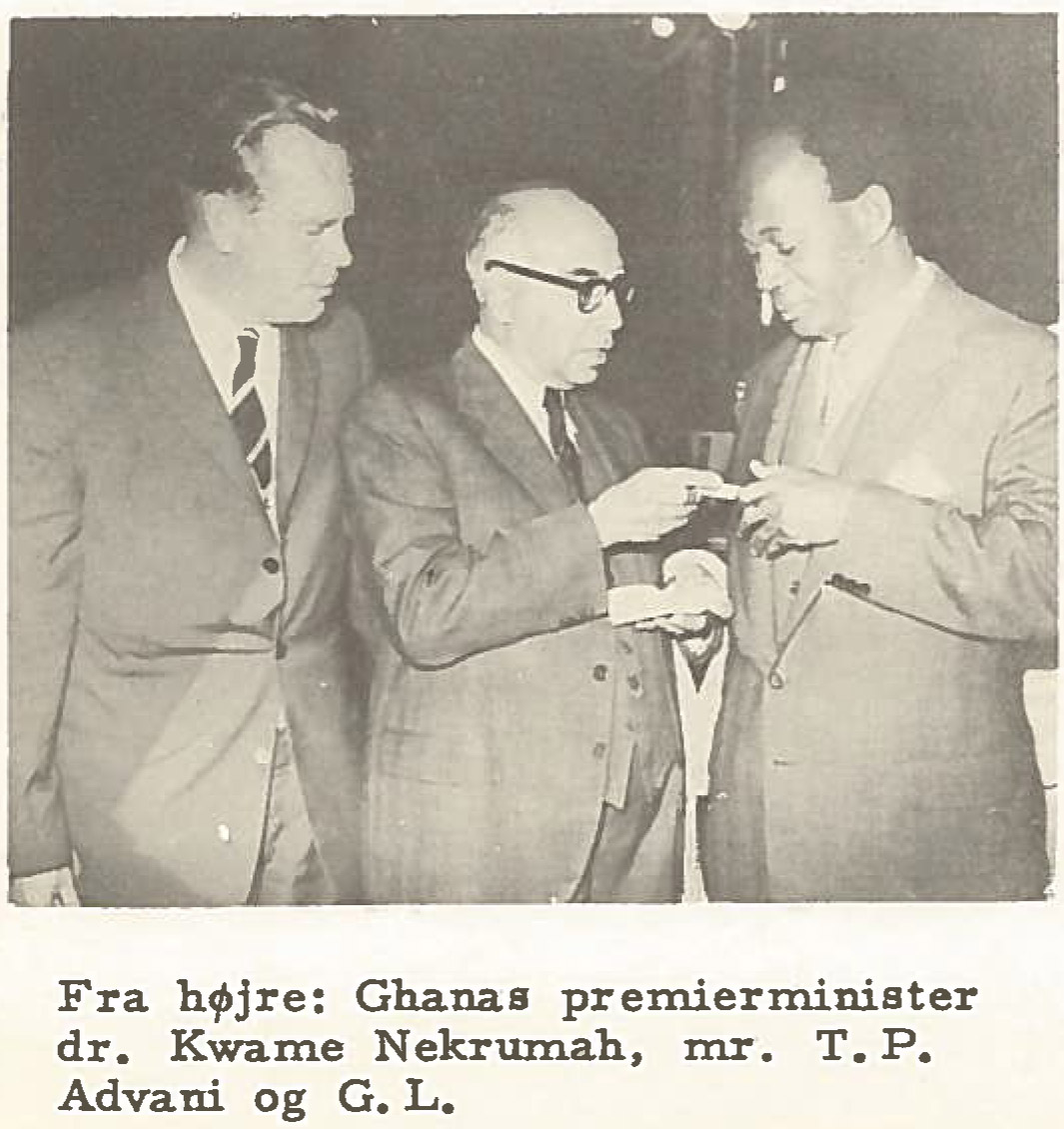 Allerede næste dag mødtes jeg igen med mange af de ambassadører, jeg den foregående aften var blevet præsenteret for, idet jeg var indbudt til reception i the Constitution Club, hvor dr. Kwame Nkrumah ville holde en kort tale. Vi blev påny festligt beværtet, og jeg havde her den store glæde ikke alene at blive præsenteret for Ghanas meget charmerende premierminister, men også at få en temmelig lang samtale med ham. Det skete på den måde, at Ghanas højkommissær venligt spurgte, hvor jeg var fra. Da han hørte, jeg var fra Danmark, bad han mig vente et øjeblik, og straks efter kom dr. Nkrumah og greb begge mine hænder, medens hele hans ansigt lyste op i et blændende smil. "Deres konge har engang hersket over os, mr. Larsson, ved De det?" Det vidste jeg, og før jeg fik set mig for, bombarderede han mig med spørgsmål om vort land. Da han fik at vide, hvad jeg foretog mig, blev han med et meget alvorlig, og bad mig så kort det var mig muligt, at forklare ham Martinus syn på livet. Jeg er efterhånden trænet i at fatte mig i korthed, men dr. Nkrumah forstod alligevel mere, end jeg turde håbe, for han udbrød spontant: "Vi skulle have et Martinus-institut i Ghana, det har vi brug for!" Han ville have et billede af os. Nu håber jeg blot, at det midt i forvirringen blev godt.