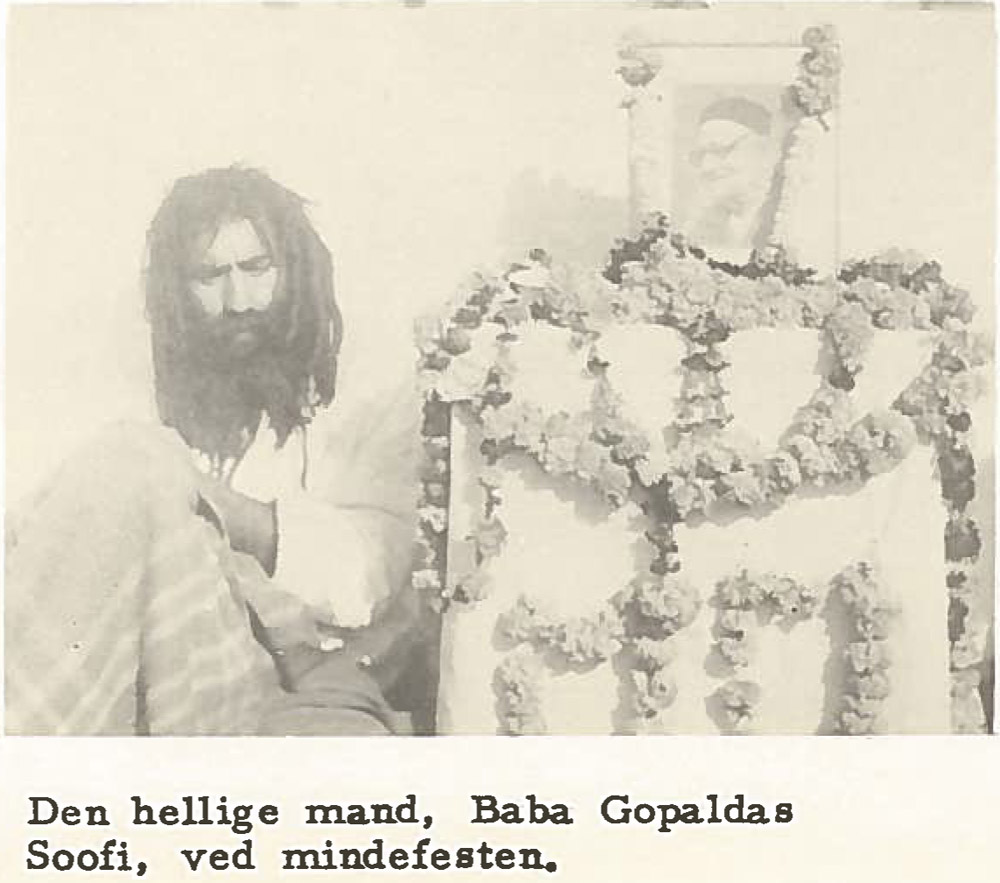 Det, der imidlertid får mig til at skildre denne fest for Dem, skyldes udelukkende, at vi midt i det hele fik besøg af den hellige mand – Baba Go – paldas Soofi – som jeg allerede har omtalt for Dem. Han ankom i sin snavsede natskjorte og sit lange, uredte, filtrede hår, og satte sig ved siden af det lille interimistiske alter. Alle bøjede sig dybt for ham, og det var mærkeligt for mig at se, hvorledes hver nyankommen gæst næsten kastede sig ned foran ham og berørte hans fødder. Selv sad jeg ganske få meter fra ham og havde nu rig lejlighed til ikke alene at betragte ham, men også at filme ham. Af os alle syntes han at være den mest ulykkelige. Der var over hans ansigt et så lidende udtryk, at man uvilkårligt blev grebet af en dyb medlidenhed med ham. Midt i det hele tændte han sig, til min store forbløffelse, en cigaret. Det var faktisk det sidste, jeg havde ventet, så det gibbede lidt i mig. Desværre fik jeg det vistnok ikke med på filmen. Men selvom jeg af hjertet undte ham den nydelse, cigaretten kunne give ham, ændrede det ikke mit indtryk af et menneske i dyb åndelig nød, og da festen var overstået, og jeg havde min vært på tomandshånd, spurgte jeg ham, om han virkelig selv opfattede denne mand som hellig, som et menneske af dyb åndelig indsigt. Min vært betragtede mig meget længe og meget indgående, før han tøvende spurgte: "Du tror ikke på ham?" Jeg svarede ærligt, at jeg måske nok troede, at han var en søgende sjæl, men absolut ikke, at han var "hellig" i dette ords virkelige betydning. Min vært sad længe og tænkte. Så kom det: Denne mand var en discipel af den mand, vi idag hyldede. Han tilbad ham og ønskede at følge ham. Men han havde et uligevægtigt sind. Han var gift, men da hans mester døde, kastrerede han sig selv og har derved opnået en slags ligevægt. Han vil være lærer, og han hjælper også mange, men vi, der kender ham, føler, at han, sin opnåede ligevægt tiltrods, er ulykkeligere end før!" – så forstod jeg!