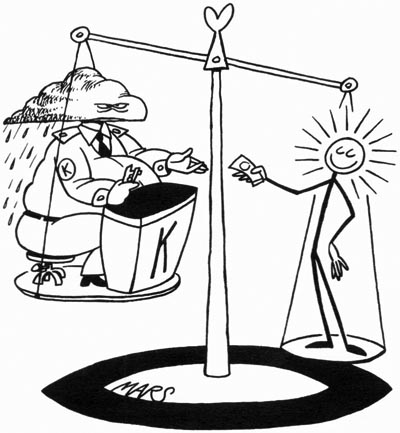 Så kommer jeg til billetkontrollen. Den viser sig at være en forhindring både i fysisk og åndelig forstand. Ud fra den lille billetluge strømmer en herlig klassisk musik, og jeg skal lige til at sige noget venligt om musikken, da jeg får øje på kontrollørens ansigtsudtryk. Han er sur. Rigtig godt sur, og jeg kan se, at han ikke på nogen måde har tænkt sig at falde ind i min glade nynnen. Men jeg giver mig ikke så let. Med al den venlighed jeg kan mobilisere, giver jeg ham kuponhæftet og beder om et klip ind til byen.
