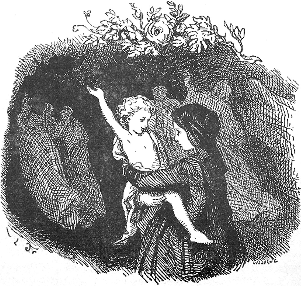 "Giv mig mit barn tilbage!" sagde moderen og græd og bad; med eet greb hun med hver hånd om to smukke blomster tæt ved og råbte til Døden: "jeg river alle dine blomster af, for jeg er i fortvivlelse!"