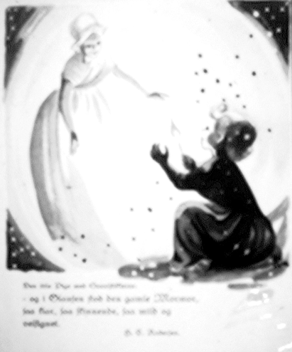 I sin lysbilledsamling havde Martinus et farvebillede af den lille pige med svovlstikkerne, der i en vision ser et strålende juletræ og sin afdøde kære bedstemoder. Dette billede brugte Martinus ofte i sine lysbilledforedrag om døden, bl.a. i Instituttets foredragssal den 19.1.1956. Her forklarer Martinus, hvordan man ovre på den anden side ved et skytsengelprincip bliver modtaget af gode venner og kære slægtninge, når man dør. Den lille pige tør ikke komme hjem, fordi hun ikke har kunnet sælge nogle tændstikker, og hun fryser ihjel på gaden. Men H.C. Andersen beskriver meget smukt, hvordan den lille pige, da hun dør, møder den, der elskede hende højst på jorden, den kære bedstemoder, der tager hende med op til Gud.