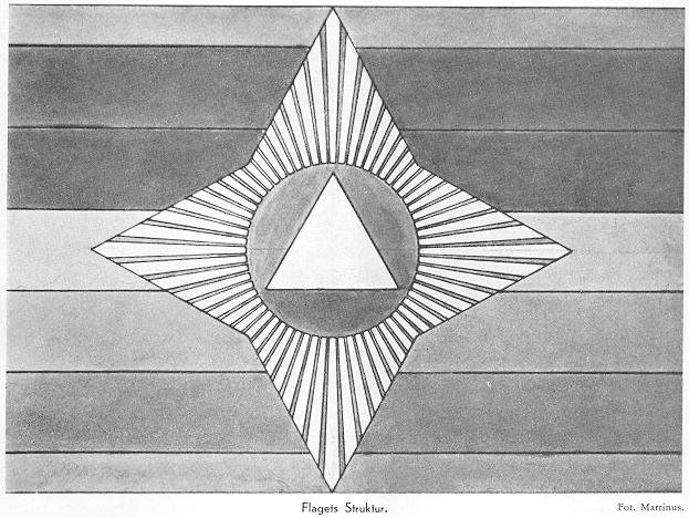 Paa Flaget er dette treenige Princip, af Hensyn til det dekorative, udtrykt i dobbelt Format, idet Pyramiden, der i sig selv udtrykker det hele, her særligt udtrykker X 1, "Det guddommelige Noget" eller det, der oplever Livet i alle levende Væsener. Feltet omkring Pyramiden og imellem de hvide Straaler fremtræder i violet Farve og udtrykker "Moderenergien", X 2 eller "Den guddommelige Skabeevne", der kommer til Manifestation i alle samtlige levende Væseners Energiudfoldelse.
