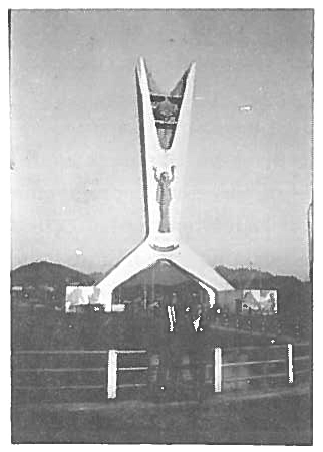 Flyveturen fra Pusan tværs over Korea til Seoul var en strålende oplevelse. Det var klart solskin, så vi hele tiden havde den dejligste udsigt til de skønne bjerglandskaber, der uafladeligt vekslede under os. Mærkeligt var det at tænke på, at også dette land for ikke ret mange år siden havde været genstand for forfærdelige krigshandlinger. Vi ankom til Seoul sent på eftermiddagen, medens solen endnu stod højt på himlen og varmen var brændende. Jeg blev modtaget af to unge mennesker, hvoraf den ene var Taekeng Kim, som jeg havde truffet i Japan. Den anden var en ung studerende ved navn Zeongkil Park. Bilturen fra flyvepladsen til Seoul er omkring 30 km og går over en mægtig bro over floden Han. Med god grund er koreanerne stolte af denne bro, der er bygget helt af koreanske ingeniører og teknikere. Vi gjorde holdt ved broens begyndelse, hvor der står et imponerende monument, der øverst bærer De forenede Nationers mærke, og neden under på den ene side har en kvindefigur i relief og på den anden side en mandsfigur. Her fotograferede jeg monumentet og mine to ledsagere.