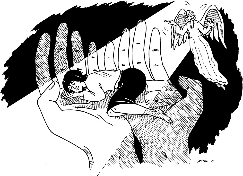 Anna tænker over visdomsordene, men falder udmattet i søvn. I drømme ser hun to store, hule hænder. En kvinde ligger og sover i dem. Anna opdager, at det er hende selv. Nogle engle rundt om hvisker ømt: "Hvil trygt i Guds favn!" "Lad Guds vilje ske!" "Flyd med!" En venlig, smilende mand nærmer sig og siger på klingende dansk: "I samme øjeblik man lægger hele den oplevede smerte i Guds hånd og gør sig fri af angsten og frygten, af hadets og bitterhedens nedbrydende kræfter, da træder en lysende engel ind i vor aura, og Guds nærhed vil føles så intenst, at frygten og sorgen forlader ens sind." (Getsemane have kap. 6)