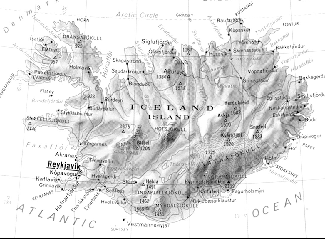 Og så er maskinen landet. Og der fremme ved afspærringerne stod mine kære og elskelige venner og vinkede. Toldpassagen forløb let. Med kærlige smil og håndtryk blev jeg derefter modtaget af vor dygtige og energiske talsmand og repræsentant heroppe, Vignir Andresson. Derefter af Gretar Fells og frue, Thorvaldur Arnason og frue, samt flere andre af mine kære venner. Derefter blev jeg modtaget af Haldora Samuelsdatter i hendes villa, hvor jeg skulle bo under mit ophold i Reykjavik. Og dermed var min rejse lykkelig og vel overstået. Jeg var nået frem til mine kære venner. Efter en lykkelig aften og i glæden over nu i nogen tid at kunne være sammen med dem gik jeg til ro. Udenfor kastede den nærliggende midnatssol sin aftenrøde over bjergene.