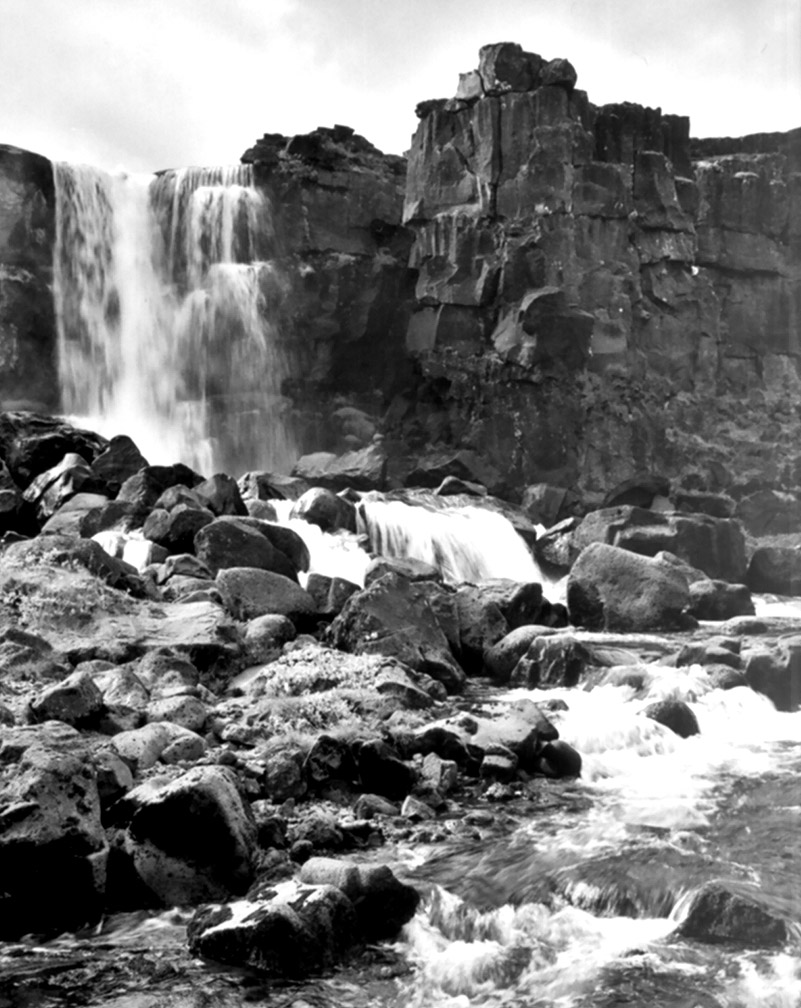 Og så dukkede Island frem i horisonten. Skyhavet var nu næsten forsvundet. Vi fløj stadig vestpå. Men derinde til højre lyste Vatna Jøkulls evige is- og snemarker. Ned fra højderne skrånede vældige slugter, fyldte med gletschere, der langsomt sniger sig nedad imod lavlandet. Men på denne deres vej kommer de neden for snegrænsen og smelter. De ender derved som større eller mindre vandstrømme, bække eller elve, der flyder ud over Islands klippefyldte terræner. Mange steder styrter de ud over meget høje lodrette klippeskrænter og bliver til vandfald. Næsten overalt på Island ser man derfor vandfald af mange forskellige dimensioner. Man ser ganske små bække, hvis styrt ud over afgrunden kun tegner sig som en ganske lille tynd, hvid stribe mod den mørke klippebaggrund, og man ser vældige floder, hvis vandmasser med niagaraagtige, tordenlignende drøn og bulder styrter ud over tårnhøje, terrasseformige afsatser, før de atter igennem regnbuetegnende skumskyer når deres leje i dalens bund. Herfra føres de videre frem igennem ørkenen til nye styrt og bulder på deres vej imod oceanet. På denne deres vej har de afgivet næring til store kraftværker, lys og varme til hjælp for islændingenes levestandard og til oplysning af deres lange vinternat.