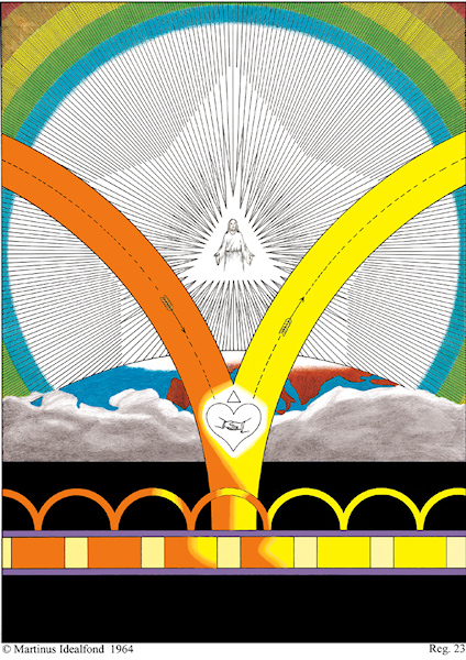 - La granda triangulo simbolas Dion, kaj la blanka radioaŭreolo ĉirkaŭ la triangulo simbolas la primaran konscion de Dio. La koloraj kampoj ekstreme ĉirkaŭ la radiaŭreolo simbolas la diversajn vivsferojn.