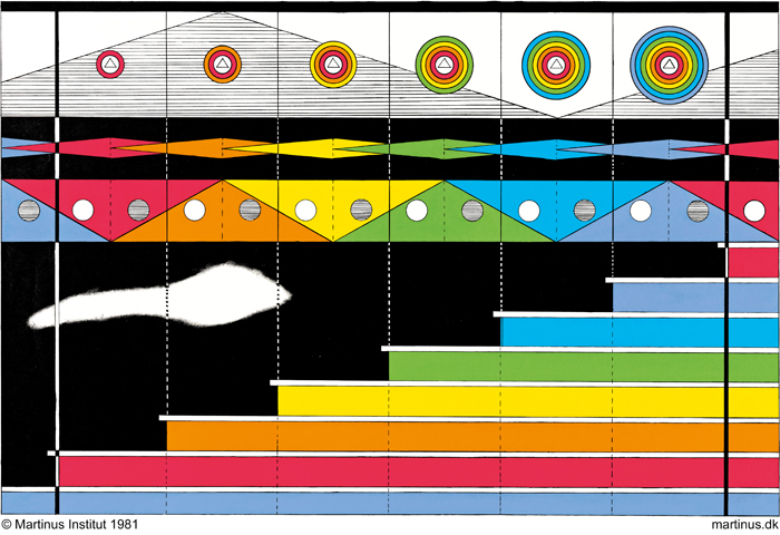 - Los colores de la ancha figura transversal encima de la figura en forma de escalera representan las diversas energías básicas por medio de las cuales el ciclo de espiral está dividido en seis reinos. En cada reino hay una figura redonda clara y una oscura. La figura clara simboliza la parte primaria o fundamental, que está creciendo y culmina. La figura oscura simboliza la parte secundaria, que está degenerando en la transición de un reino a otro.